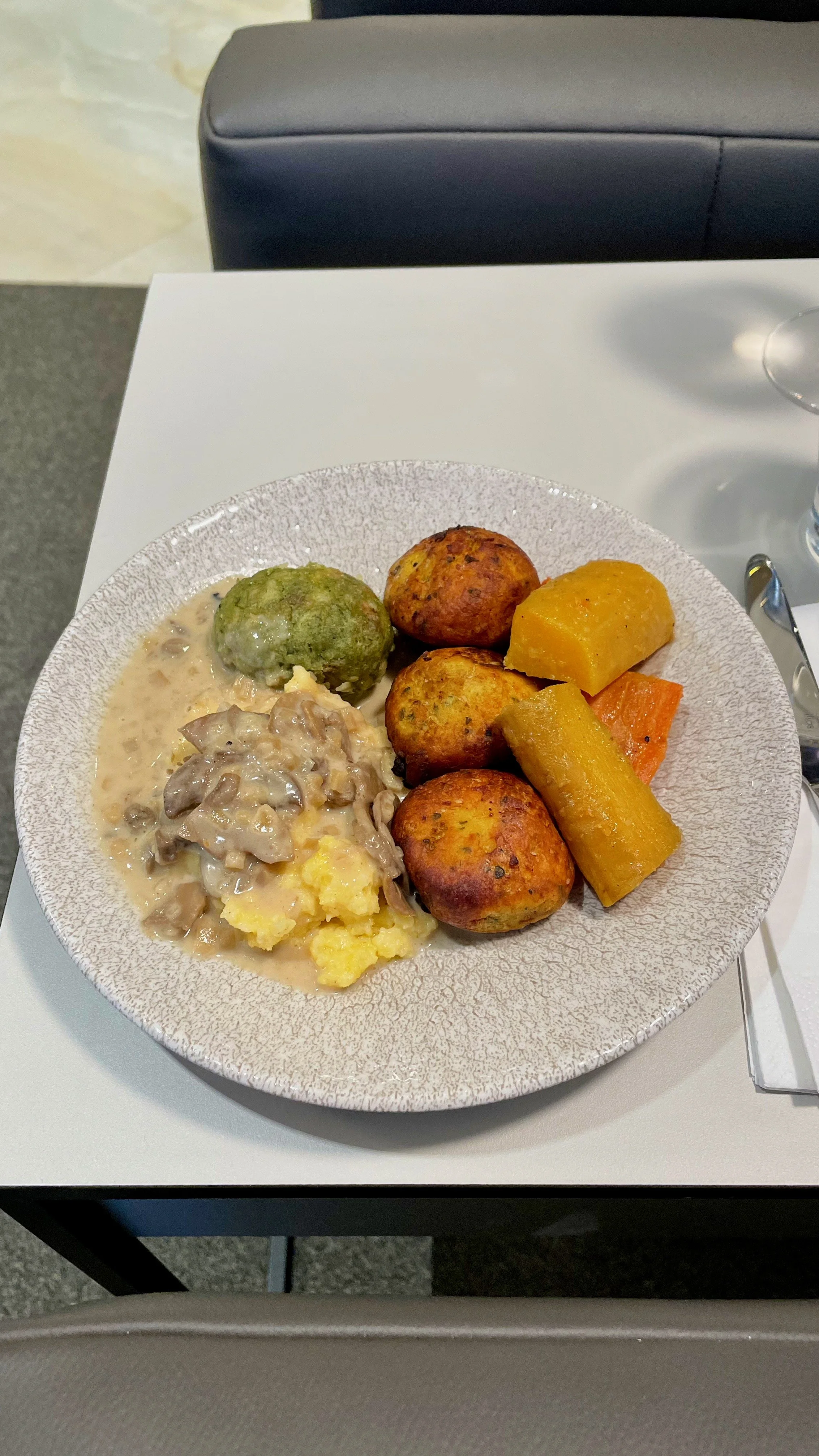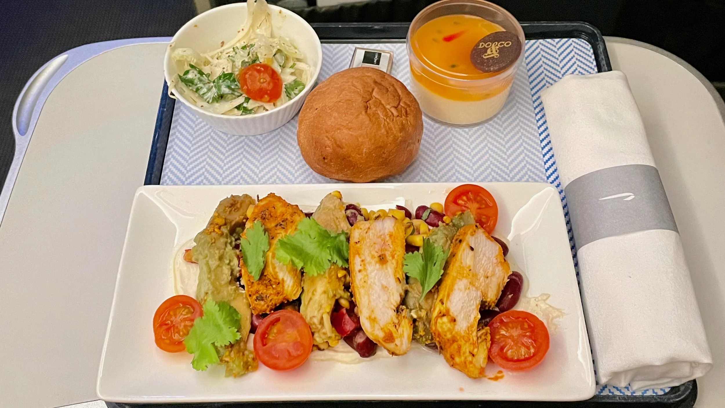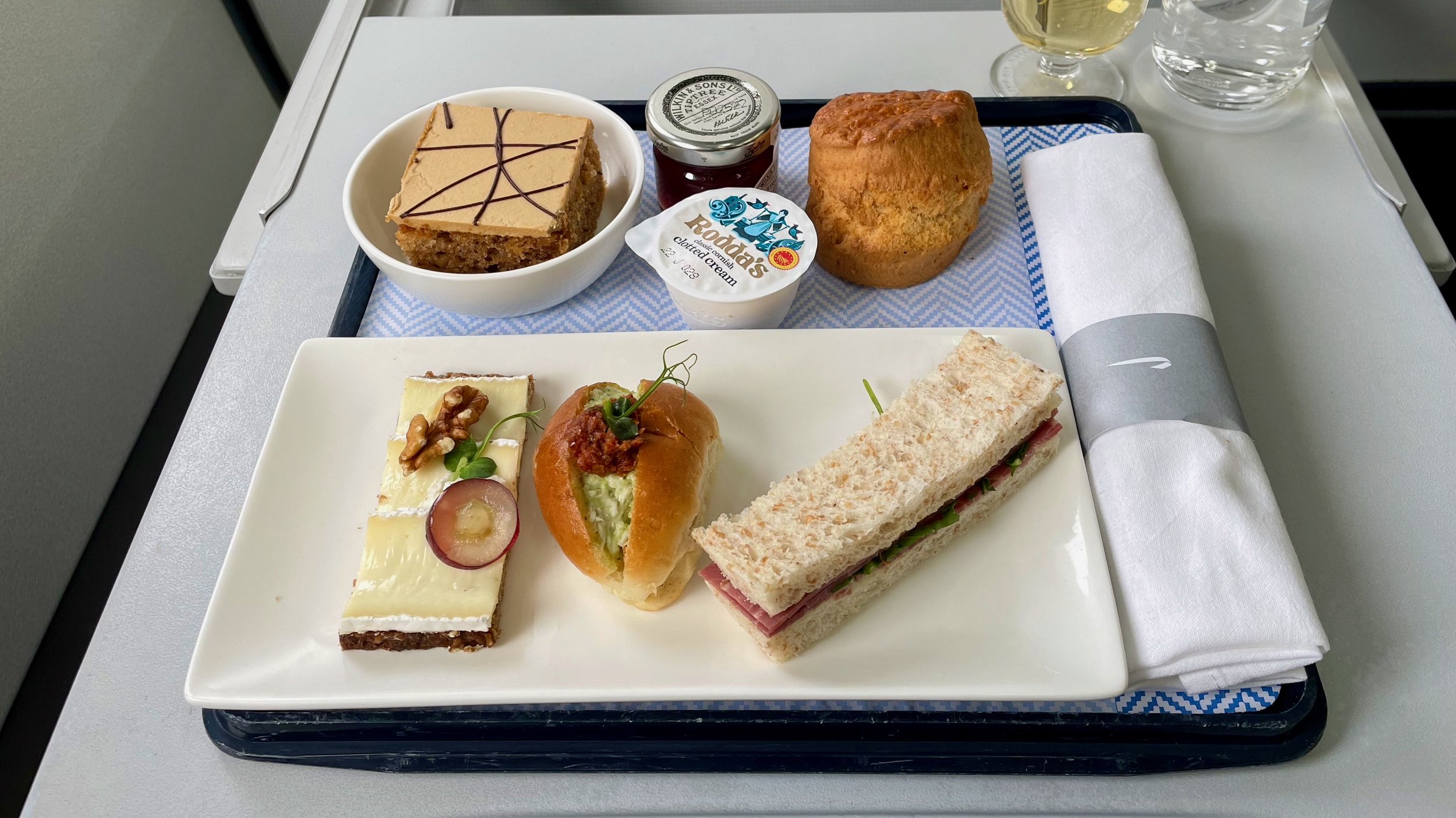 The was Kieran’s first business class flight and so I was relieved that we had managed to secure seats in Row 1 so he could have the full experience. The crew were great throughout, although they spent a lot of their time trying to appease a couple of passengers sat a couple of rows behind us who had kicked off about crew moving the bags of other passengers around to free up overhead locker space for other passengers. We both felt it was a bit unnecessary as it wasn’t their bags. With the return of full service, came the return of meal bandings which meant that only a cold salad option was available for our flight due to its short length. The Chicken Salad was flavourful and the Mango and Passionfruit Panna Cotta was spot on.