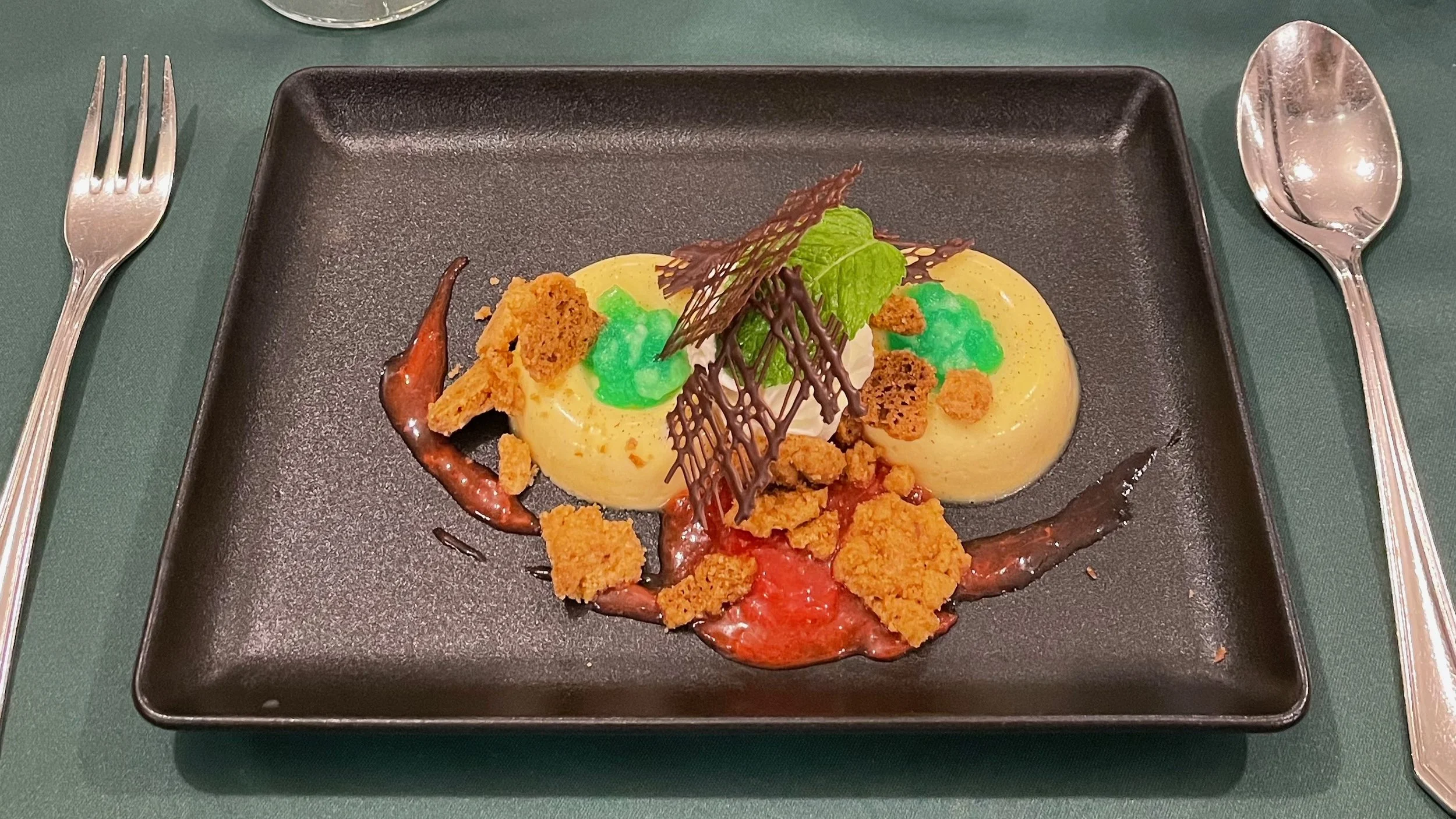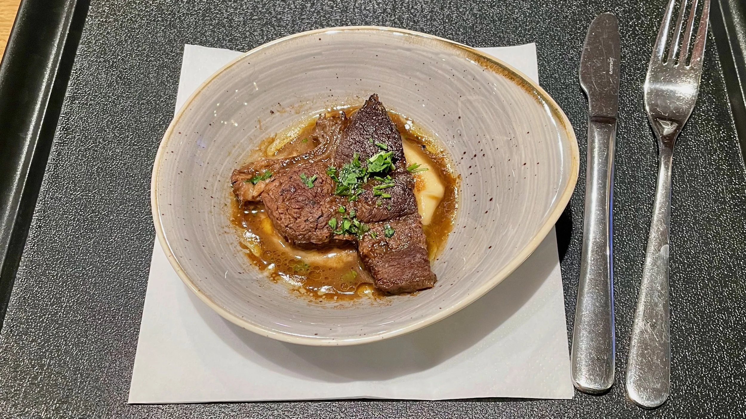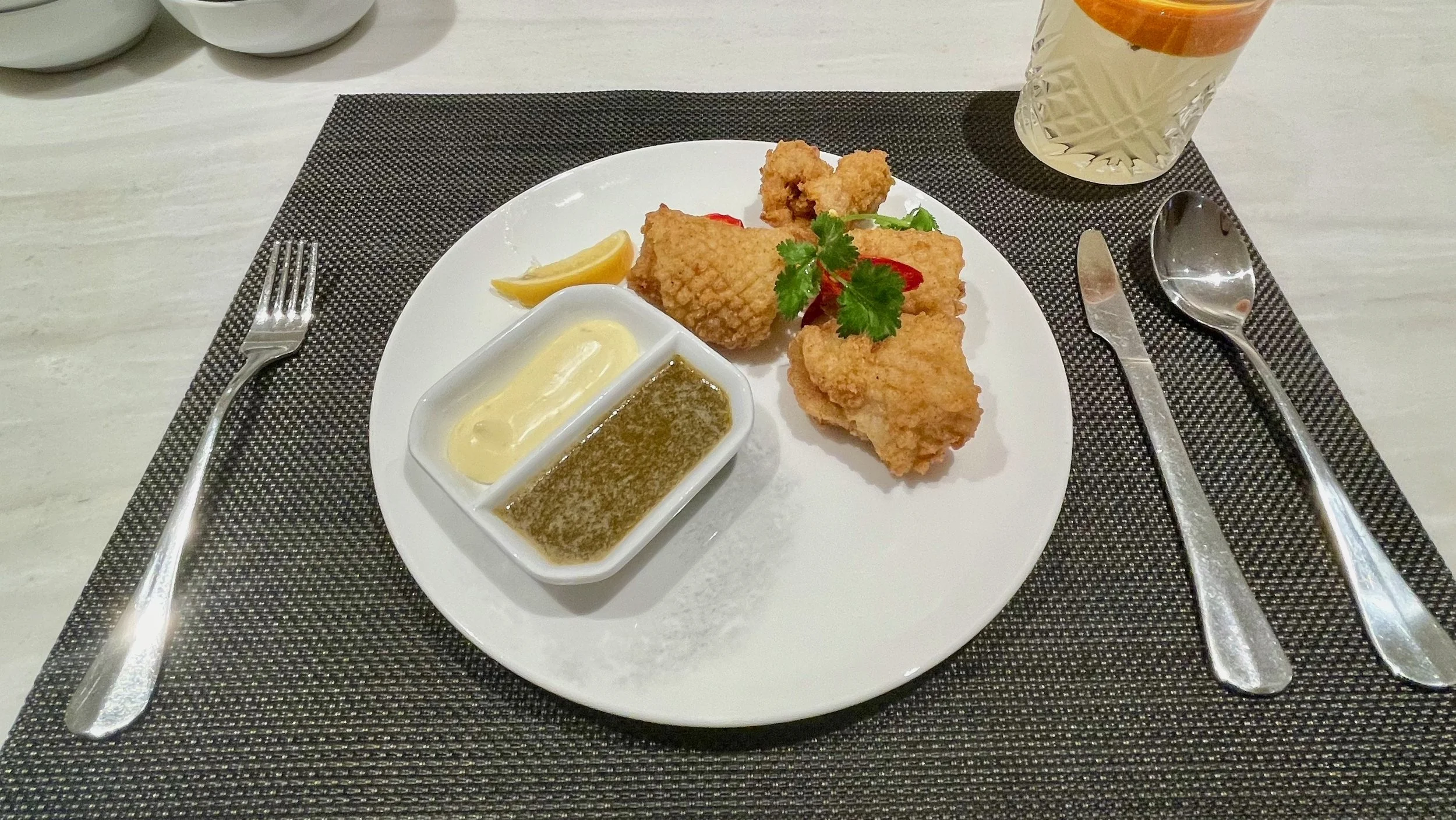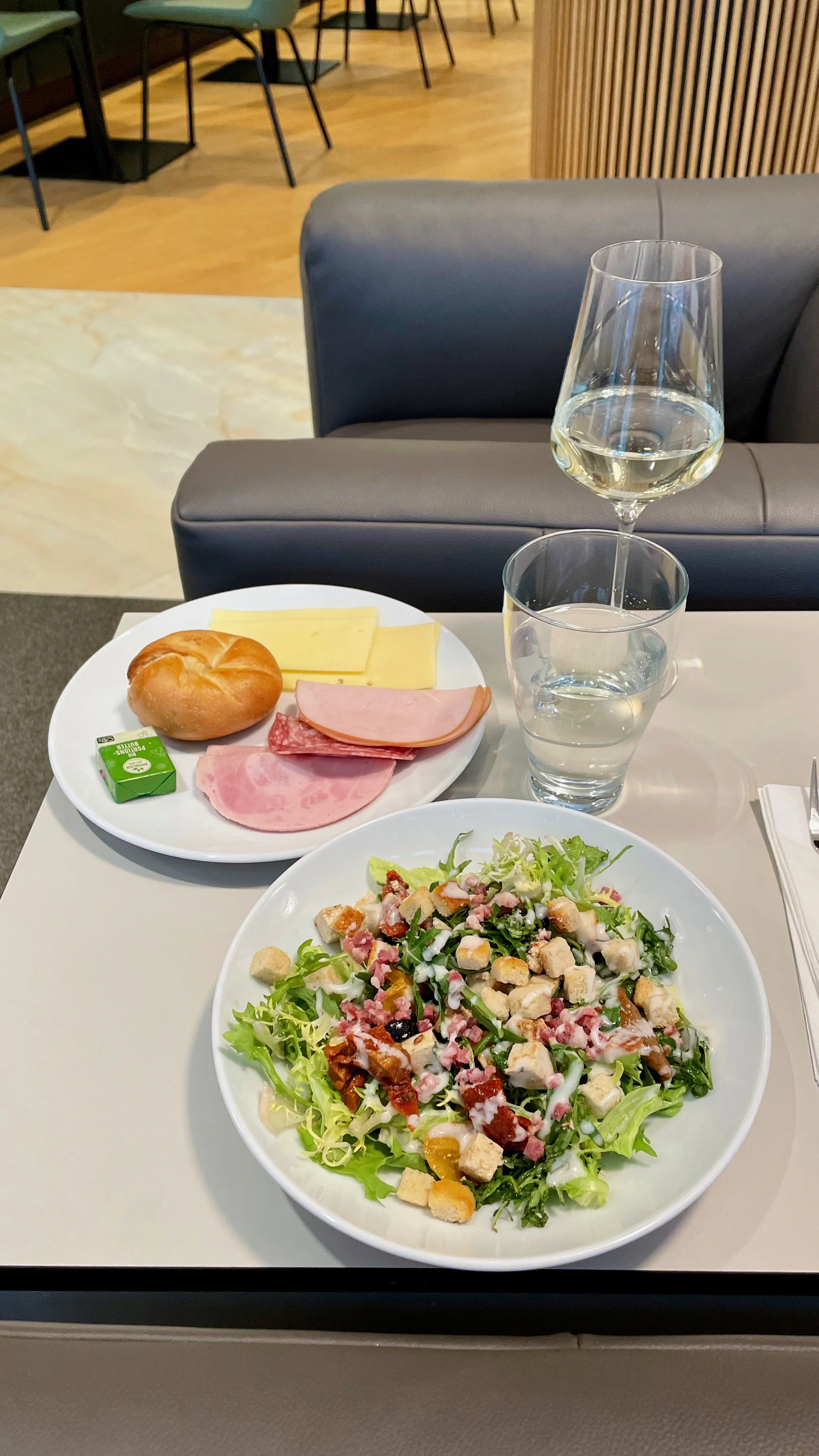 The was Kieran’s first business class flight and so I was relieved that we had managed to secure seats in Row 1 so he could have the full experience. The crew were great throughout, although they spent a lot of their time trying to appease a couple of passengers sat a couple of rows behind us who had kicked off about crew moving the bags of other passengers around to free up overhead locker space for other passengers. We both felt it was a bit unnecessary as it wasn’t their bags. With the return of full service, came the return of meal bandings which meant that only a cold salad option was available for our flight due to its short length. The Chicken Salad was flavourful and the Mango and Passionfruit Panna Cotta was spot on.