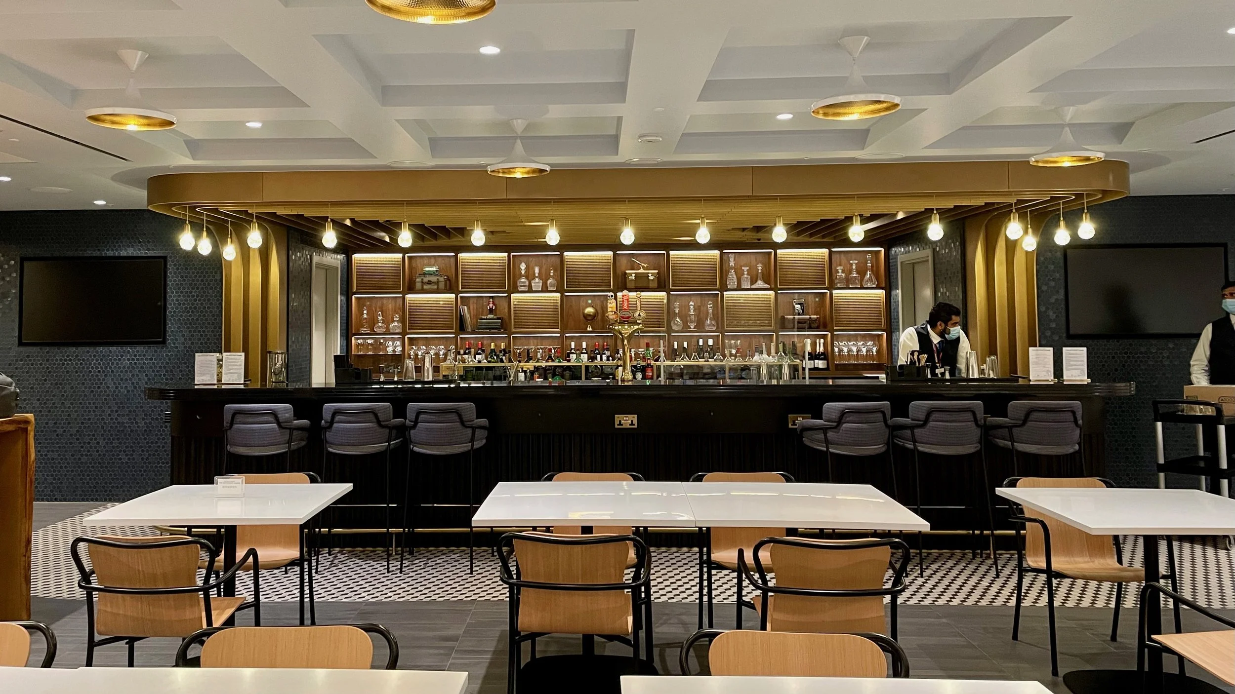 As you walk in to the lounge for the first time, it is evident that a lot of thought has been put in to the design of the lounge. The use of wood, select colours and art helps to uniquely style each part of the lounge in a modern and welcoming way. There are a variety of areas around the lounge including soft seating, private booths, privacy rooms for phone calls and a restaurant/bar area centred around a very classy looking bar.